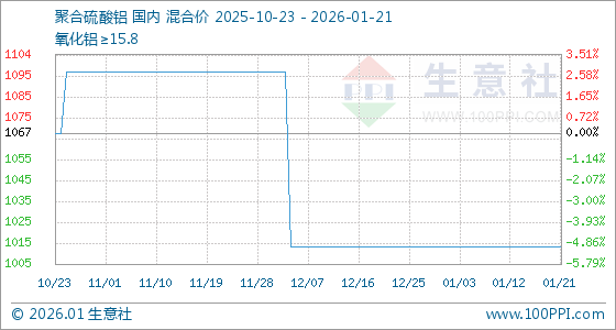 1月21日,生意社聚合硫酸铝基准价为1014.00元/吨,与本月初持平。