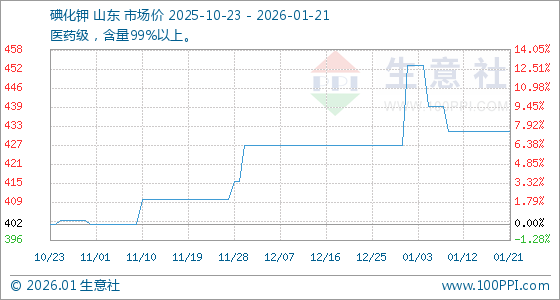 1月21日,生意社碘化钾基准价为432.00元/公斤,与本月初(427.50元/公斤)相比,上涨了1.05%。