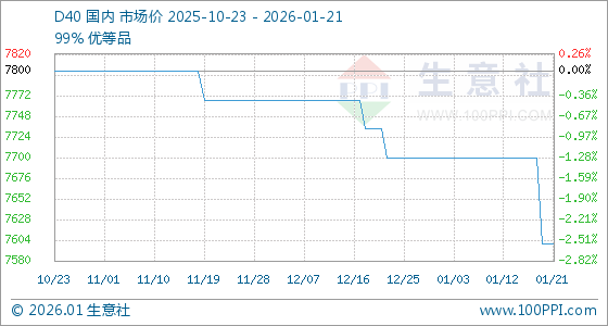 1月21日,生意社D40基准价为7600.00元/吨,与本月初(7700.00元/吨)相比,下降了1.3%。