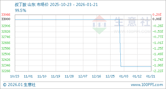 1月21日,生意社叔丁胺基准价为32333.33元/吨,与本月初(33000.00元/吨)相比,下降了2.02%。