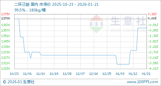 1月21日,生意社二环己胺基准价为13600.00元/吨,与本月初(13300.00元/吨)相比,上涨了2.26%。