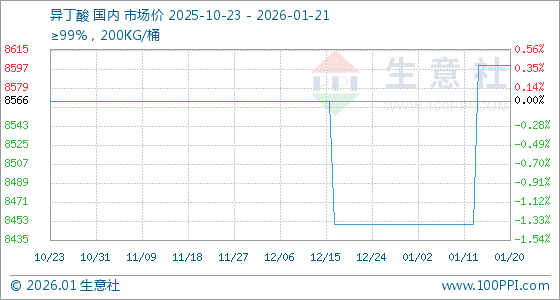 1月21日,生意社异丁酸基准价为8600.00元/吨,与本月初(8450.00元/吨)相比,上涨了1.78%。