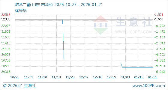 1月21日,生意社对苯二酚基准价为30500.00元/吨,与本月初(30666.67元/吨)相比,下降了0.54%。
