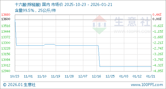 1月21日,生意社十六酸(棕榈酸)基准价为13000.00元/吨,与本月初持平。