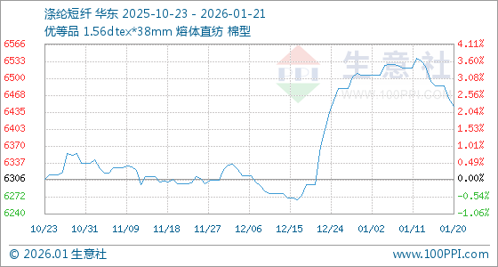 1月21日,生意社涤纶短纤基准价为6446.53元/吨,与本月初(6507.33元/吨)相比,下降了0.93%。