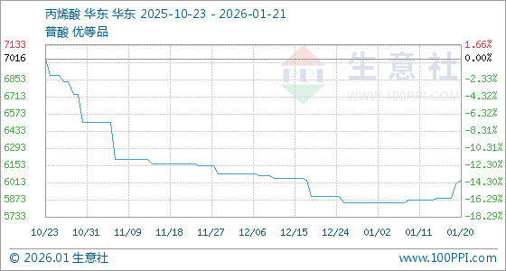 1月21日,生意社丙烯酸基准价为6033.33元/吨,与本月初(5850.00元/吨)相比,上涨了3.13%。
