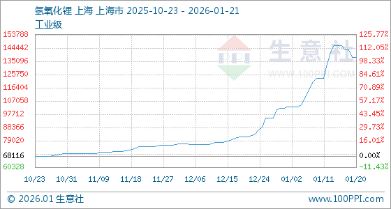 1月21日,生意社氢氧化锂(工业级)基准价为138000.00元/吨,与本月初(101833.33元/吨)相比,上涨了35.52%。