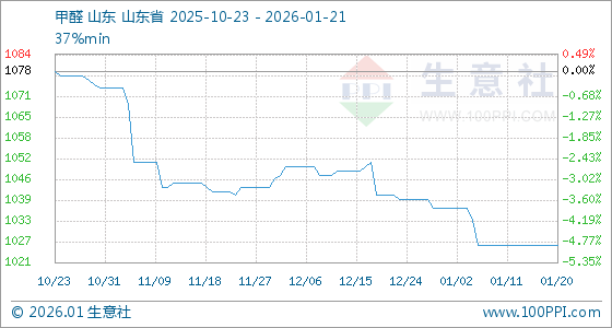 1月21日,生意社甲醛基准价为1026.25元/吨,与本月初(1037.50元/吨)相比,下降了1.08%。