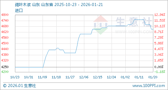1月21日,生意社阔叶木浆基准价为4650.00元/吨,与本月初(4683.33元/吨)相比,下降了0.71%。