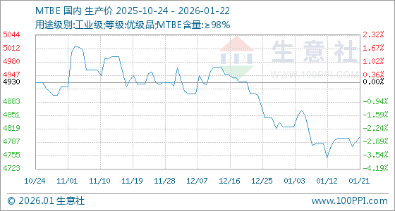 1月22日,生意社MTBE基准价为4800.00元/吨,与本月初(4823.33元/吨)相比,下降了0.48%。