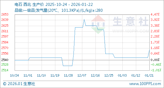 1月22日,生意社电石基准价为2566.00元/吨,与本月初(2546.00元/吨)相比,上涨了0.79%。