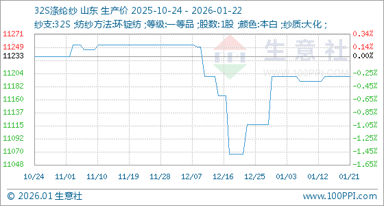 1月22日,生意社32S涤纶纱基准价为11200.00元/吨,与本月初持平。