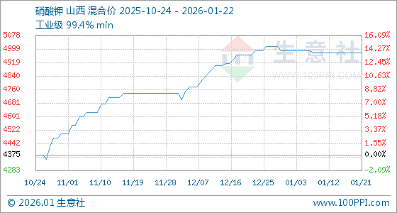 1月22日,生意社硝酸钾基准价为4975.00元/吨,与本月初(4987.50元/吨)相比,下降了0.25%。