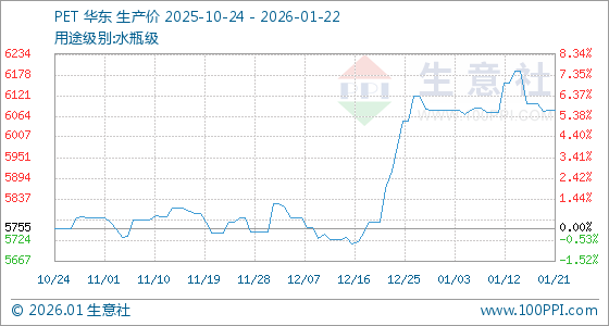 1月22日,生意社PET基准价为6082.50元/吨,与本月初(6080.00元/吨)相比,上涨了0.04%。