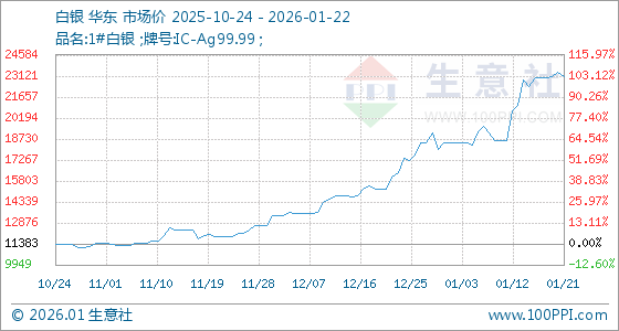 1月22日,生意社白银基准价为23105.00元/千克,与本月初(18480.00元/千克)相比,上涨了25.03%。