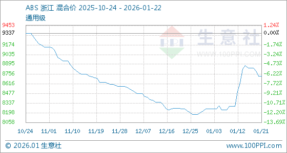 1月22日,生意社ABS基准价为8725.00元/吨,与本月初(8250.00元/吨)相比,上涨了5.76%。