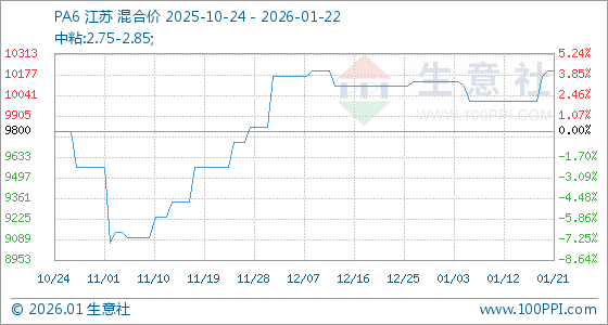 1月22日,生意社PA6基准价为10200.00元/吨,与本月初(10133.33元/吨)相比,上涨了0.66%。