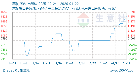 1月22日,生意社苯胺基准价为8645.00元/吨,与本月初(7945.00元/吨)相比,上涨了8.81%。
