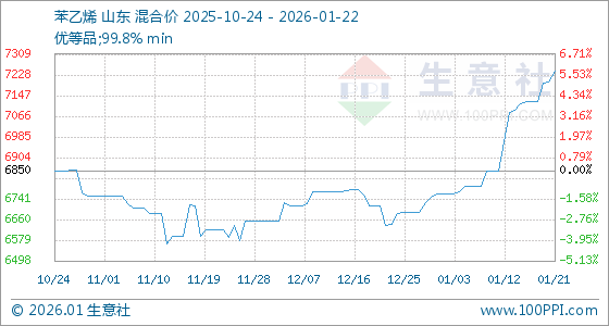 1月22日,生意社苯乙烯基准价为7242.00元/吨,与本月初(6760.00元/吨)相比,上涨了7.13%。