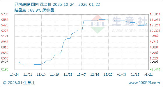 1月22日,生意社己内酰胺基准价为9500.00元/吨,与本月初(9561.67元/吨)相比,下降了0.64%。