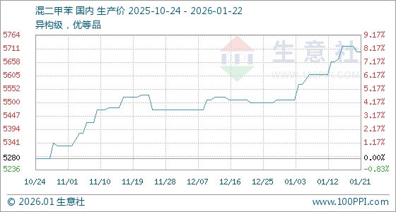 1月22日,生意社混二甲苯基准价为5700.00元/吨,与本月初(5510.00元/吨)相比,上涨了3.45%。