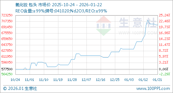 1月22日,生意社氧化钕基准价为697500.00元/吨,与本月初(632500.00元/吨)相比,上涨了10.28%。