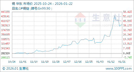 1月22日,生意社锡基准价为397410.00元/吨,与本月初(326340.00元/吨)相比,上涨了21.78%。