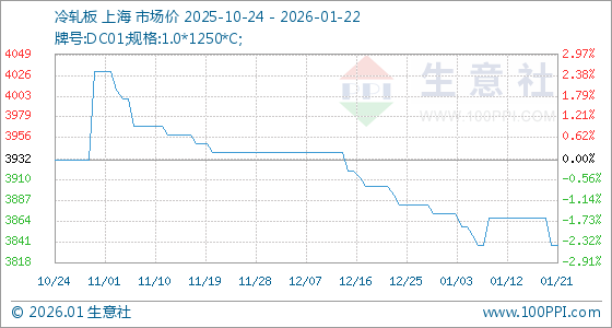 1月22日,生意社冷轧板基准价为3837.50元/吨,与本月初(3872.50元/吨)相比,下降了0.9%。