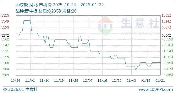 1月22日,生意社中厚板基准价为3202.00元/吨,与本月初(3192.00元/吨)相比,上涨了0.31%。