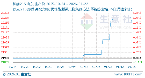 1月22日,生意社棉纱21S基准价为22200.00元/吨,与本月初(22066.67元/吨)相比,上涨了0.60%。
