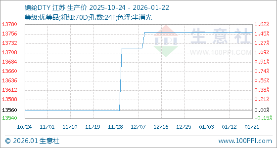 1月22日,生意社锦纶DTY基准价为13760.00元/吨,与本月初持平。