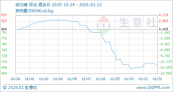 1月22日,生意社动力煤基准价为703.75元/吨,与本月初(707.50元/吨)相比,下降了0.53%。