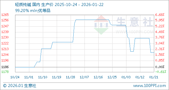 1月22日,生意社轻质纯碱基准价为1208.00元/吨,与本月初(1250.00元/吨)相比,下降了3.36%。