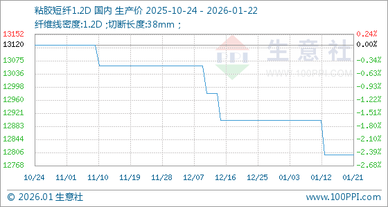 1月22日,生意社粘胶短纤1.2D基准价为12800.00元/吨,与本月初(12900.00元/吨)相比,下降了0.78%。