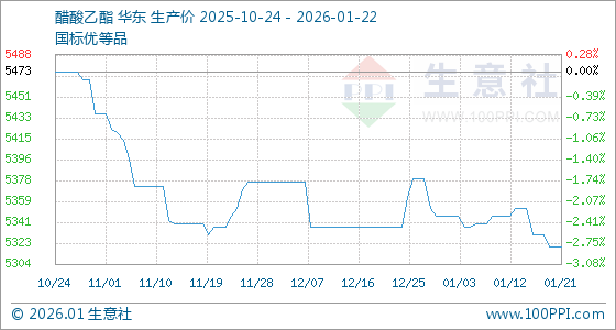 1月22日,生意社醋酸乙酯基准价为5320.00元/吨,与本月初(5346.67元/吨)相比,下降了0.5%。