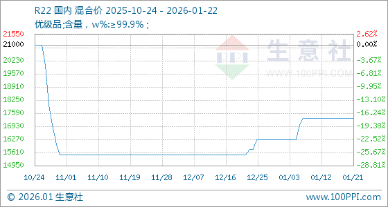 1月22日,生意社R22基准价为17333.33元/吨,与本月初(16250.00元/吨)相比,上涨了6.67%。
