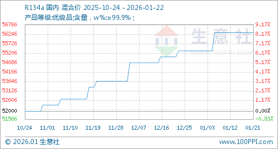 1月22日,生意社R134a基准价为56333.33元/吨,与本月初(55333.33元/吨)相比,上涨了1.81%。