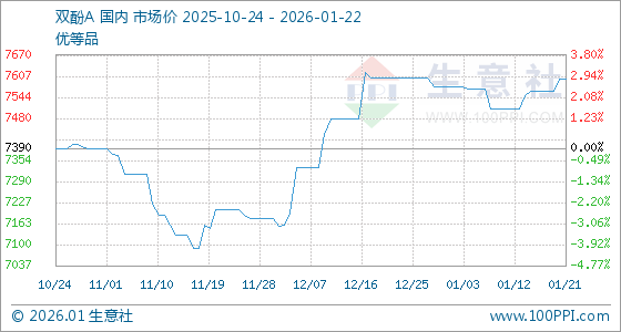 1月22日,生意社双酚A基准价为7600.00元/吨,与本月初(7576.00元/吨)相比,上涨了0.32%。