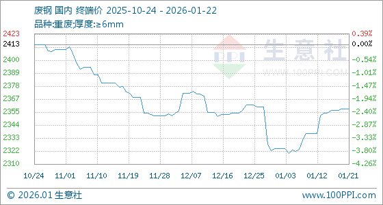 1月22日,生意社废钢基准价为2358.58元/吨,与本月初(2324.33元/吨)相比,上涨了1.47%。