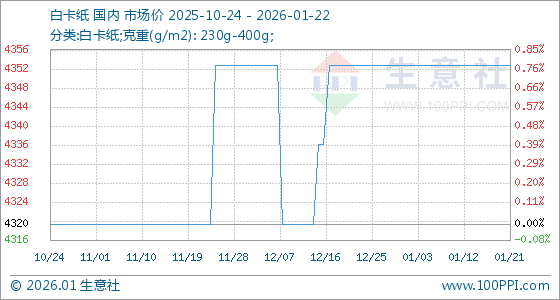 1月22日,生意社白卡纸基准价为4353.33元/吨,与本月初持平。