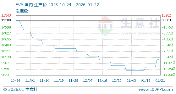 1月22日,生意社EVA基准价为10150.00元/吨,与本月初(9766.67元/吨)相比,上涨了3.92%。
