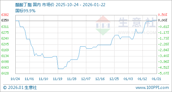 1月22日,生意社醋酸丁酯基准价为6352.50元/吨,与本月初(6250.00元/吨)相比,上涨了1.64%。
