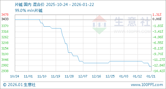 1月22日,生意社片碱基准价为2983.33元/吨,与本月初(3033.33元/吨)相比,下降了1.65%。