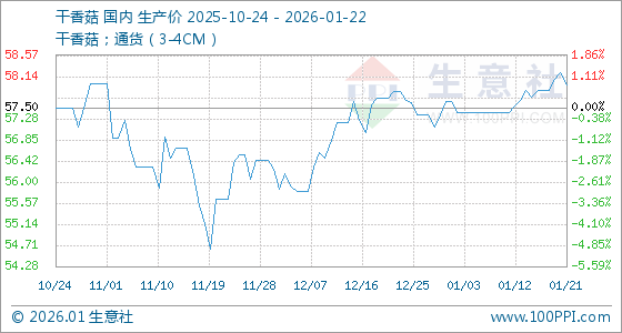 1月22日,生意社干香菇基准价为57.98元/公斤,与本月初(57.64元/公斤)相比,上涨了0.59%。