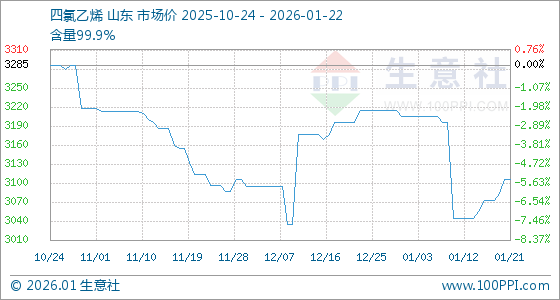 1月22日,生意社四氯乙烯基准价为3105.56元/吨,与本月初(3205.00元/吨)相比,下降了3.1%。