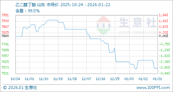 1月22日,生意社乙二醇丁醚基准价为7571.43元/吨,与本月初(7616.67元/吨)相比,下降了0.59%。
