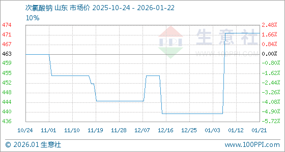1月22日,生意社次氯酸钠基准价为471.67元/吨 ,与本月初(440.00元/吨 )相比,上涨了7.20%。