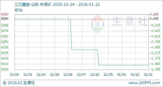 1月22日,生意社三乙醇胺基准价为6200.00元/吨,与本月初持平。