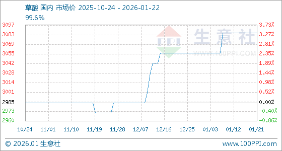 1月22日,生意社草酸基准价为3085.71元/吨,与本月初(3057.14元/吨)相比,上涨了0.93%。