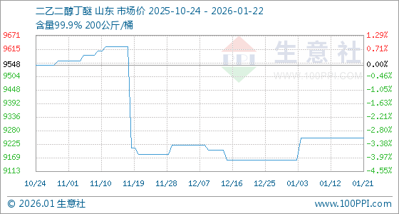 1月22日,生意社二乙二醇丁醚基准价为9250.00元/吨,与本月初(9160.00元/吨)相比,上涨了0.98%。